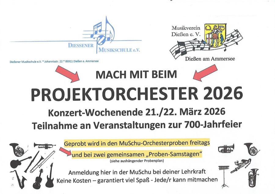 Im Rahmen der 700-Jahrfeier der Marktgemeinde Dießen wird es wieder als Gemeinschaftsprojekt mit dem Musikverein Dießen ein Projektorchester 2026 geben.